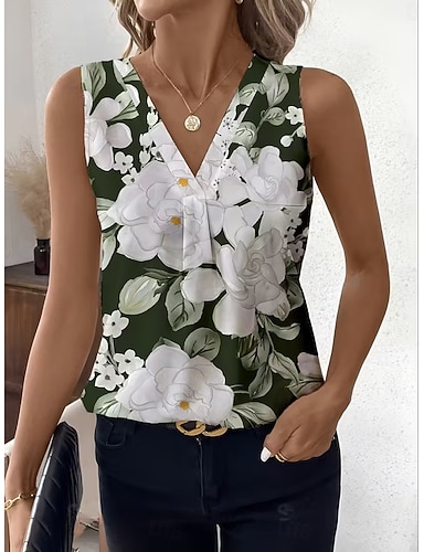 Mulheres Malha Íntima Floral Gráfico Plantas Elegante Vintage Tropical Sem Manga Decote V Tops regulares Diário Verde Claro Verde Tropa Verão Primavera