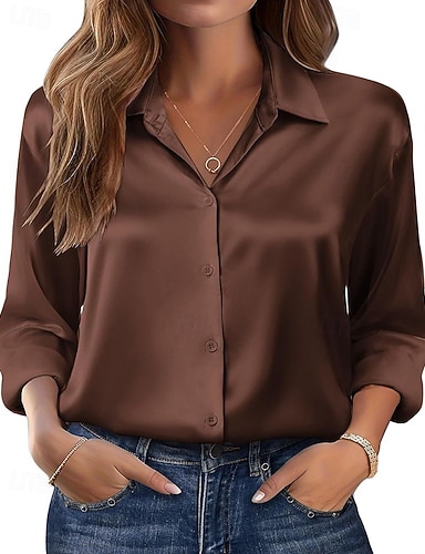 Mulheres Camisa Social Elegant Elegante Top de cetim Botões Côr Sólida à moda Básico Casual Manga Longa Colarinho de Camisa Tops regulares Diário Para Noite Branco Amarelo Roxo Marron Primavera Outono