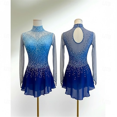 Vestidos para Patinação Artística Mulheres Patinação no Gelo Vestidos Azul+Azul Claro Patchwork Thumbhole Micro-Elástica Treino Competição Roupa para Patinação Clássico Cristal / Strass Manga Longa