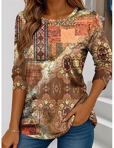 Mulheres Camiseta Imprimir Gráfico Geométrica Vintage à moda Casual Manga Longa Pescoço Entalhado Tops regulares Diário Final de semana Azul Amarelo Roxo Verde Primavera Outono Inverno