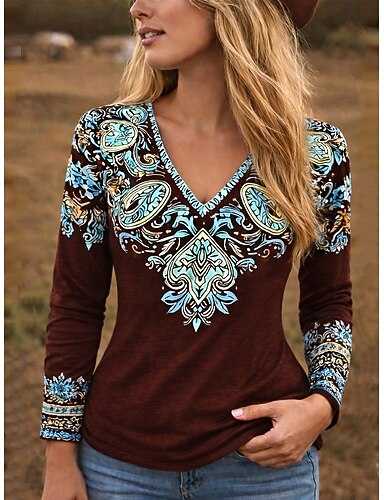 Mulheres Camiseta Imprimir Gráfico Estampado Cashemere Vintage à moda Casual Manga Longa Decote V Tops regulares Diário Final de semana Roupa de Praia Marron Escuro Verão Primavera