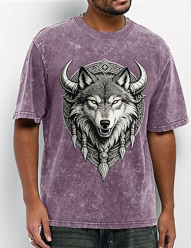 Camiseta masculina com estampa de cabeça de lobo com chifres, emblema de escudo viking, lavagem ácida, estilo streetwear vintage, manga curta, gola redonda, casual, para uso diário, de grife, tamanhos
