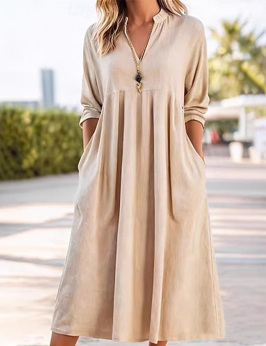 Mulheres Vestido midi Linho de algodão sintético Vestido Kaftan Moda Clássico Moderno Ao ar livre Férias Feriado Normal Tecido Manga 3/4 Decote V Preto Verde Tropa Laranja Azul Escuro Verão