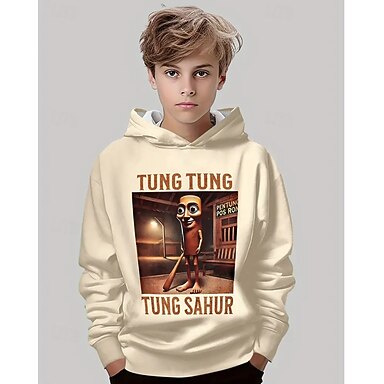 Moletom com capuz estampa 3D Tung Tung para meninos, manga comprida, moda primavera/outono, streetwear, crianças de 4 a 12 anos, com capuz, casual, para atividades ao ar livre, ajuste regular