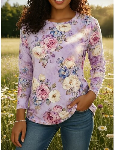 Mulheres Camiseta Imprimir Gráfico Plantas Moda Clássico Casual Manga Longa Gola Redonda Tops regulares Diário Final de semana Azul Roxo Laranja Verão Primavera