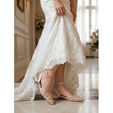 Sapatilhas de casamento femininas de salto baixo bordadas com pérolas na cor champanhe – sapatos de noiva elegantes para casamentos no jardim.