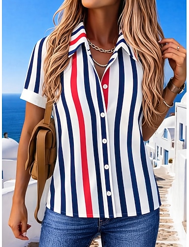 Mulheres Camisa Social Gráfico Geométrica Listrado Vintage Tropical à moda Manga Curta Colarinho de Camisa Tops longos Diário Branco Verão Primavera