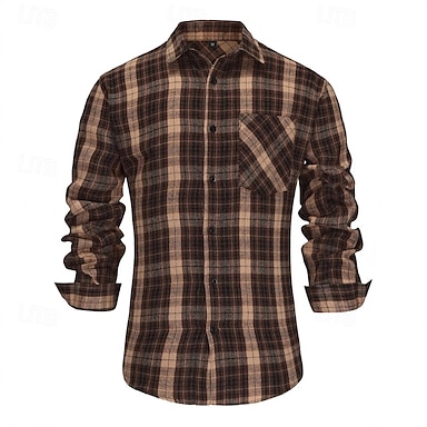 Homens Camisa Social camisa de verão Camisa casual camisa de praia camisa de botão Camisas xadrez Café Manga Longa Xadrez Lapela Férias Havaiana Botão para baixo Roupa Moda Casual Confortável