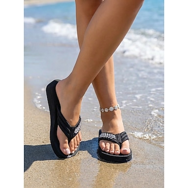 Chinelo de praia feminino preto - sandálias confortáveis de dedo com detalhes em lantejoulas douradas, perfeitas para férias de verão e escapadas para praias tropicais. &relaxando à beira da piscina