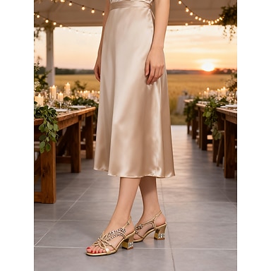 Sandálias femininas douradas de salto baixo com strass - elegantes sapatos slingback com recortes florais e salto bloco confortável, estilo perfeito para a mãe da noiva em um ambiente rústico de