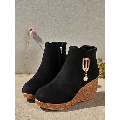 Botas pretas de cano curto com salto plataforma para mulheres – botinhas chiques de salto alto com forro de lã, zíper lateral e detalhe decorativo de pérola sintética, calçado versátil para outono, inverno e ocasiões formais.