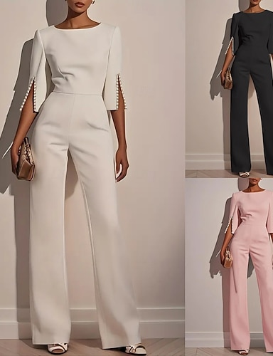 Mulheres Normal Macacão Elegante Côr Sólida Meia Manga Perna larga Decote Redondo Cintura Alta Escritório Trabalho Normal Preto Branco Rosa Verão