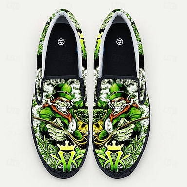 Tênis slip-on masculino verde para o Dia de São Patrício – confortáveis e estilosos com estampa de trevo, ideais para festas, comemorações e uso casual.