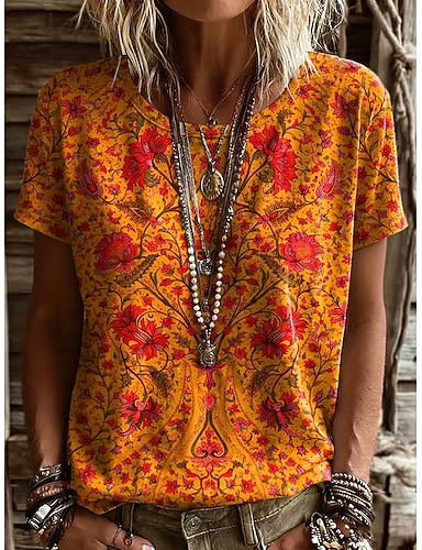Mulheres Camiseta Imprimir Gráfico Plantas Vintage à moda Clássico Manga Curta Gola Redonda Tops regulares Diário Final de semana Vermelho Laranja Bege Verão Primavera