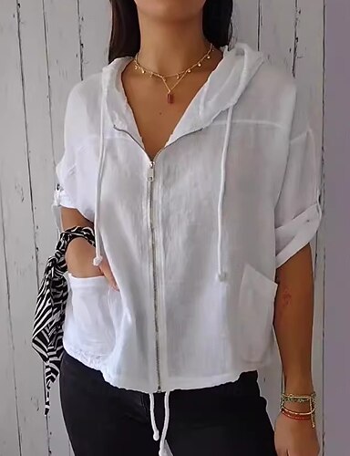 Camisa de Linho Falso para Mulheres Camisa Casual Camisa de Botões Ruchada Zíper Bolso Cor Sólida Estilosa Casual Praia Manga Curta Capuz Diária Roupas de Férias Branca Verde