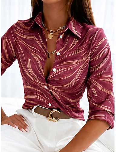 Mulheres Camisa Social Blusa Botões Imprimir Gráfico Geométrica Listrado Vintage à moda Casual Manga Longa Colarinho de Camisa Tops regulares Diário Preto Vermelho Roxo Verde Cáqui Primavera Outono
