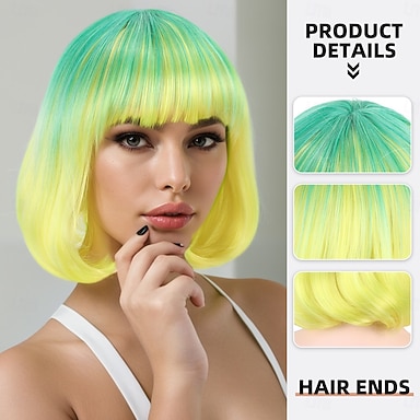 peruca curta de 14″ verde degradê reta para mulheres – franja completa, peruca sintética, perfeita para o Halloween &sessões de fotos