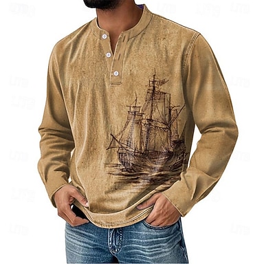 Homens Gráfico Vintage Camisa Henley Camisetas Manga Longa Vintage Moda Designer Casual Diário Ao ar livre Primavera Primavera & Outono Todas as Estações Marron Escuro Verde Militar Cinzento Escuro