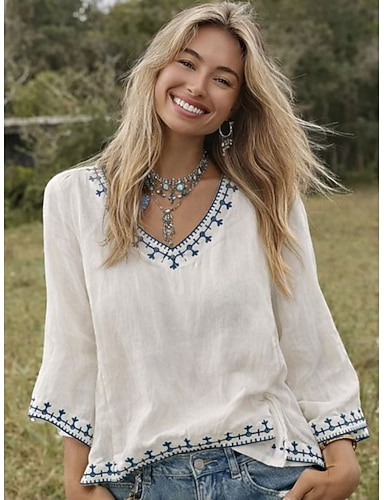 Mulheres Blusa Camisa de linho sintético Bordado Côr Sólida à moda Casual Manga 3/4 Decote V Tops regulares Diário Azul Branco Rosa Verão Primavera Outono