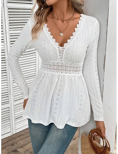 Mulheres Blusa Textura Topo de ilhó Camiseta Pointelle Camiseta Ilhó Tecido Moda Clássico Casual Manga Longa Decote V Tops regulares Casual Diário Praia Branco Primavera Outono
