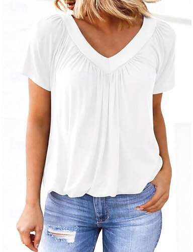 Mulheres Camiseta Franzido Vintage à moda Casual Manga Curta Decote V Tops longos Diário Para Noite Azul Branco Rosa Verde Escuro Roxo Verão Primavera