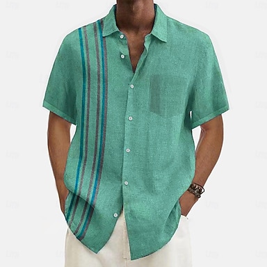 Homens camisa de verão Camisa casual camisa de praia camisa de botão Azul Verde Manga Curta Padrão Riscas Lapela Férias Havaiana Roupa Poliéster Moda Casual Confortável