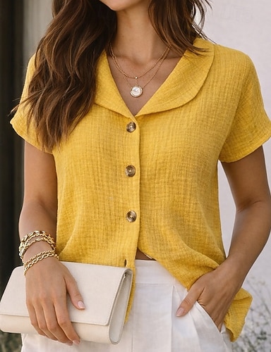 Mulheres Camisa Social Camisa casual camisa de botão Linho de algodão sintético Côr Sólida Tecido Elegante Férias Moda Manga Curta Decote V Tops regulares Streetwear Praia Feriado Amarelo Verão