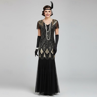 Loucos anos 20 Anos 20 Até o Tornozelo Festa de Casamento Despedida de solteiro Roupa Tamanho Grande Sem Mangas O Grande Gatsby Convidado do casamento Paetês Contas Purpurina Brilhante Decote V