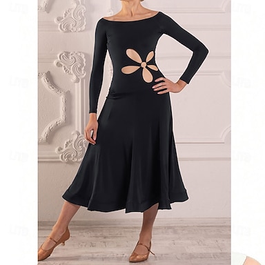 Vestido de dança de salão feminino com recorte de manga longa, vestido moderno para competição de tango e valsa latina – preto
