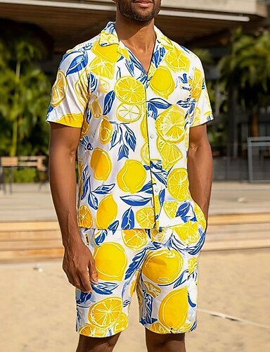 Homens Fruta 2pcs Conjuntos de camisas Camisa Social Manga Curta Calças curtas colar cubano Férias Casual Diário Festa Impressão 3D Verão Amarelo