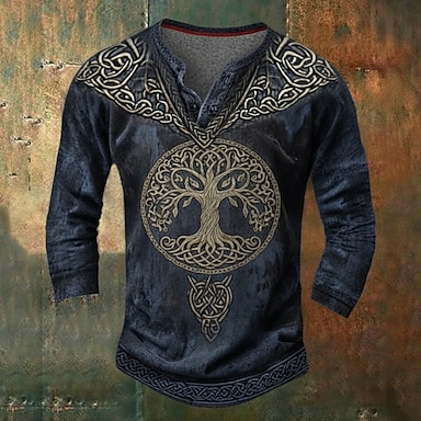 Homens Gráfico Árvore Vintage Camisa Henley Manga Longa Estilo bonito Retro Vintage Casual Casual Feriado Para Noite Primavera & Outono Todas as Estações Azul Escuro Henley Camiseta Henley