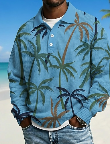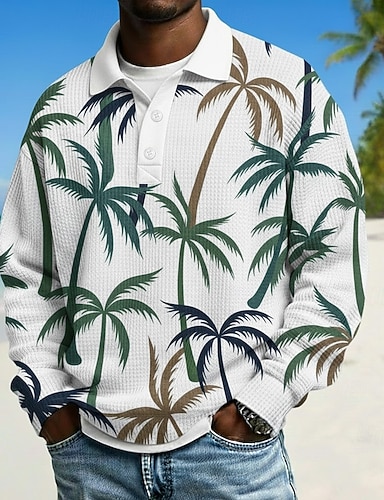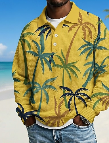 Homens Palmeira Camisas Polo Waffle Manga Longa Camisas polo Lapela Havaiana Roupa Esportiva Roupa Diária Roupas de férias Impressão 3D Primavera Outono Inverno Amarelo Verde Arco-íris
