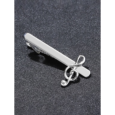 Prendedor de gravata masculino em liga metálica com formato de nota musical, acessório elegante e formal para casamentos, festas e trajes de negócios, design sofisticado em prata.