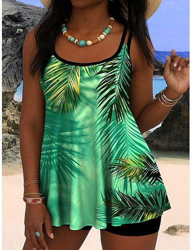 Tankini Feminino de 2 Peças com Short Costas Cheeky Sem Costas Roupas de Praia de Férias com Folhas e Decote em U Sem Mangas