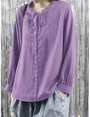 Mulheres Camisa Social Blusa Linho de algodão sintético Patchwork Botões Côr Sólida Tecido Elegante à moda Básico Manga Longa Gola Redonda Tops regulares Diário Feriado Para Noite Preto Roxo Verão