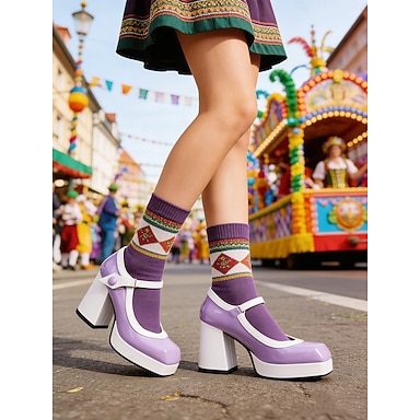 Saltos Plataforma Roxos Femininos de Mardi Gras com Acentos Brancos - Estilo de Carnaval Retrô Perfeito para Desfiles e Eventos Festivos