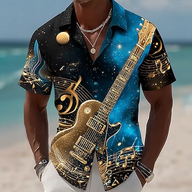 Homens Guitarra Instrumento Musical Notas musicais Camisa Social camisa de botão Manga Curta Vintage retrô Diário Festival de Música Verão Primavera Aberto para a Lateral Impressão 3D camisas de