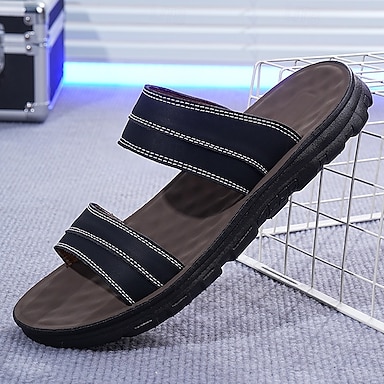 Sandálias de couro sintético marrom masculinas com tira larga, palmilha macia, design fácil de calçar para adultos, ideal para relaxamento em ambientes internos, lounge de verão, uso confortável em casa