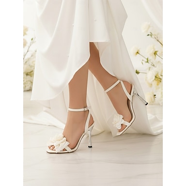 Sapatos de noiva femininos de salto alto com tira no tornozelo e estampa floral marfim – elegantes sapatos de noiva de bico aberto para cerimônias no jardim e ao ar livre.