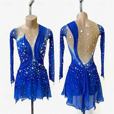 Vestidos para Patinação Artística Mulheres Patinação no Gelo Vestidos Azul Patchwork Barra Assimétrica Com Stretch Treino Competição Roupa para Patinação Clássico Cristal / Strass Manga Longa