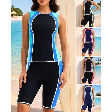 Mulheres Roupa de banho Tankini 2 Peças Retalhos Perna na altura do joelho Secagem Rápida Elástico Sem Manga Roupa de Banho roupa de banho Surfe Mergulho Praia Verão
