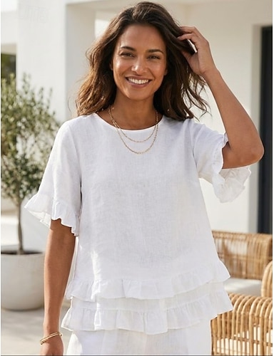 Mulheres Blusa Linho de algodão sintético Frufru Tecido Diário à moda Básico Manga Curta Gola Redonda Tops regulares Diário Trabalho Feriado Preto Branco Cinzento Verão