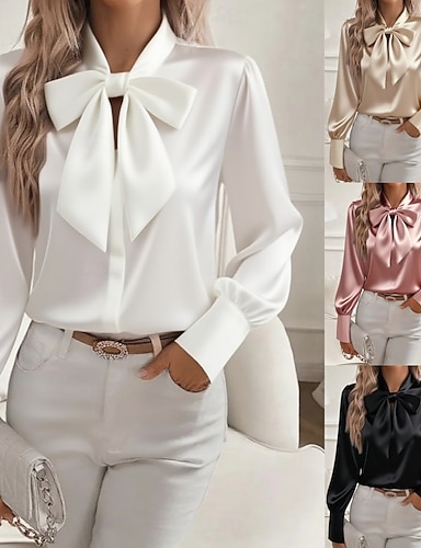 Mulheres Blusa de cetim Saia Blusa Laço Côr Sólida Tecido Elegante à moda Básico Manga Longa Decote V Tops regulares Diário Trabalho Festa Preto Branco Rosa Cáqui Primavera Outono Inverno