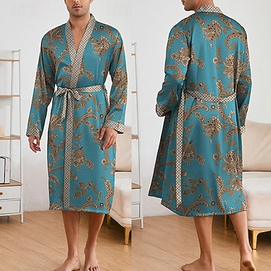 Homens Pijamas Manto de Seda Roupa de Dormir Roupão 1 PC Estampas Abstratas Moda à moda Clássico Diário Casa De Cama Poliéster Conforto Macio Decote V Manga Longa Cinto Incluso Primavera Outono Azul