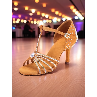 Sapatos de dança latina feminina com detalhes em strass - sapatos profissionais de salto alto para dança de salão, salsa e tango, com tira em T, ideais para apresentações e competições.