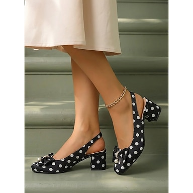 Sapatos de salto alto femininos com estampa de bolinhas - elegantes sapatos de salto slingback pretos e brancos com laço. &Detalhe em pérola para festas vintage e eventos rockabilly. &roupa clássica