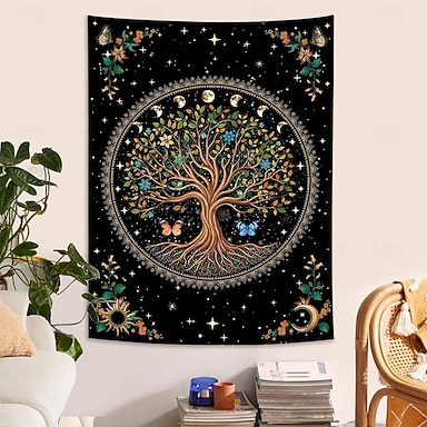tapeçaria de parede com fases da lua celestial, árvore da vida, borboletas, estrelas, mandala floral, arte mística boho hippie, decoração para quarto, sala de estar, dormitório, meditação, ioga.