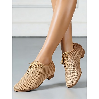Sapatos de dança profissionais femininos nude com cadarço e tela respirável, salto baixo, para salão de baile. &Sapatos para prática de latim em estúdio