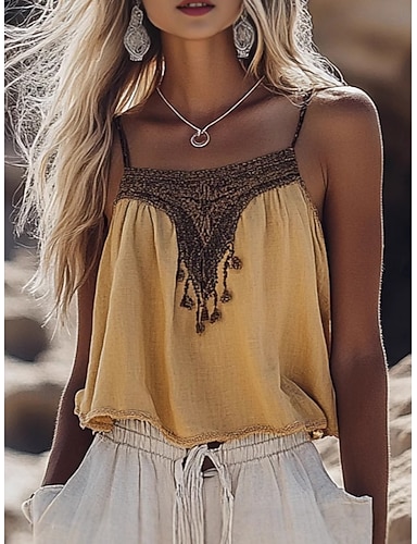 Mulheres Blusa Camisola Regata camisa sem manga Bloco de cor Boêmia à moda Clássico Sem Manga Com Alças Tops curtos Diário Feriado Para Noite Amarelo Verão Primavera