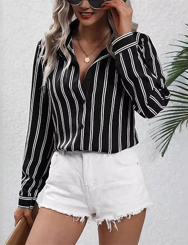Mulheres Tops de verão Blusa Tops elegantes Franzido Patchwork Botões Gráfico Tecido Listrado Elegante Vintage senhoras Manga Longa Colarinho de Camisa Tops regulares Diário Trabalho Feriado Azul